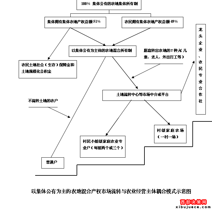 依據這一《憲法》精神可同理提出“土地以集體公有為主,非集體(農民)所有為輔”的集體土地所有制新形式,從經營的角度看,“土地以集體公有為主”用集體土地統(tǒng)一經營權來表達,“非集體所有為輔”用農民土地承包經營權來表達,從產權數量上看,讓前者集體占集體土地產權的51%,讓后者農民占集體土地產權的49%(簡稱51:49式土地集體所有制)。由此可見,試驗設計所提出的集體土地所有制新形式與當前農村雙層經營體制是完全一致的。