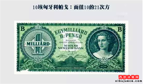 匈牙利帕戈在第二次世界大戰(zhàn)后失去價(jià)值,遭受到紀(jì)錄上有史以來(lái)最嚴(yán)重的貨幣貶值,物價(jià)飛漲到了無(wú)法控制的地步,計(jì)價(jià)時(shí)需要用到極高的位數(shù),面值10垓帕戈的鈔票,舊匈牙利的鈔票,面值是100,000,000,000,000,000,000,也就是10的21次方帕戈(可能紙幣上實(shí)在放不下這么多0,所以面額是用文字表示的)。