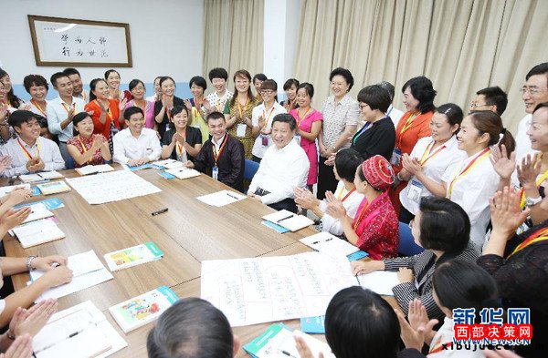 ?。?014年9月9日,習(xí)近平來(lái)到北京師范大學(xué)看望教師學(xué)生,向全國(guó)廣大教師和教育工作者致以崇高的節(jié)日敬禮和祝賀。這是習(xí)近平同正在北師大參加“中小學(xué)教師國(guó)家級(jí)培訓(xùn)計(jì)劃”的貴州小學(xué)骨干語(yǔ)文教師交流。新華社記者姚大偉攝)