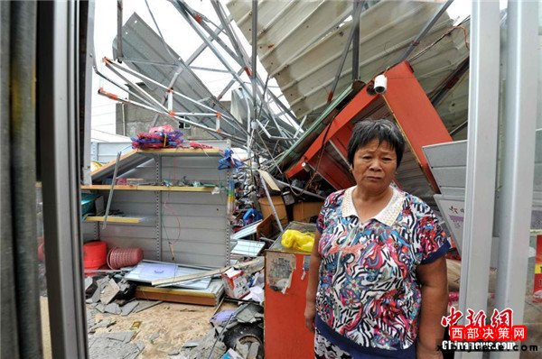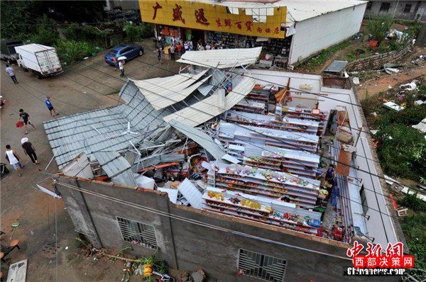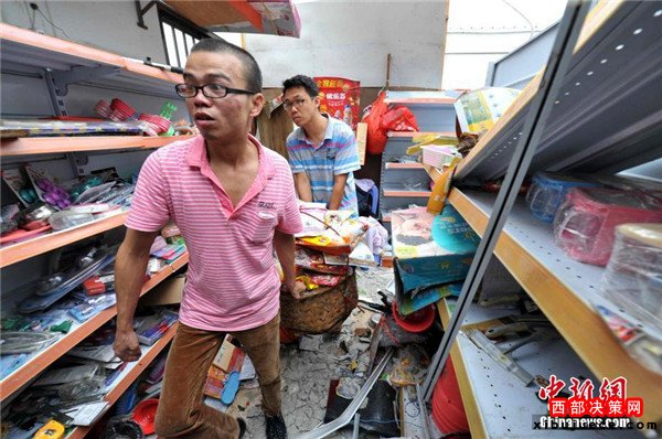 9月15日,今年第14號臺風(fēng)“莫蘭蒂”于凌晨3時(shí)05分在廈門翔安區(qū)沿海登陸,登陸時(shí)中心附近最大風(fēng)力15級(48米/秒,強(qiáng)臺風(fēng)級),中心氣壓945百帕,給翔安當(dāng)?shù)貛韲?yán)重?fù)p失。圖為翔安一超市被摧毀。