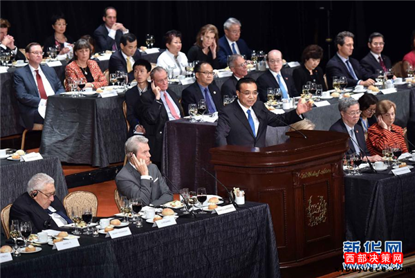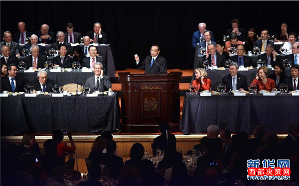 李克強(qiáng)出席紐約經(jīng)濟(jì)俱樂(lè)部舉行的歡迎宴會(huì)并致辭和回答提問(wèn)