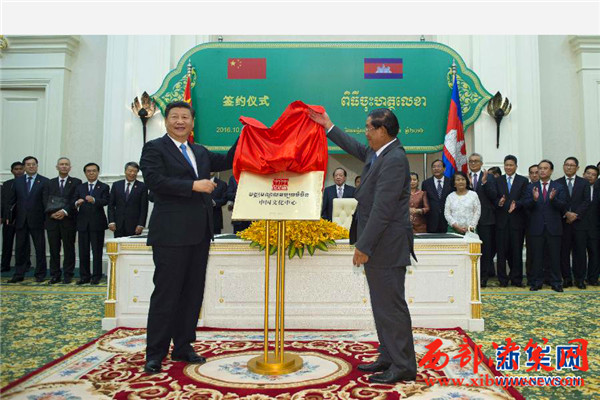 10月13日,國家主席習近平在金邊同柬埔寨首相洪森舉行會談。會談后,兩國領(lǐng)導人共同出席金邊中國文化中心揭牌儀式。
