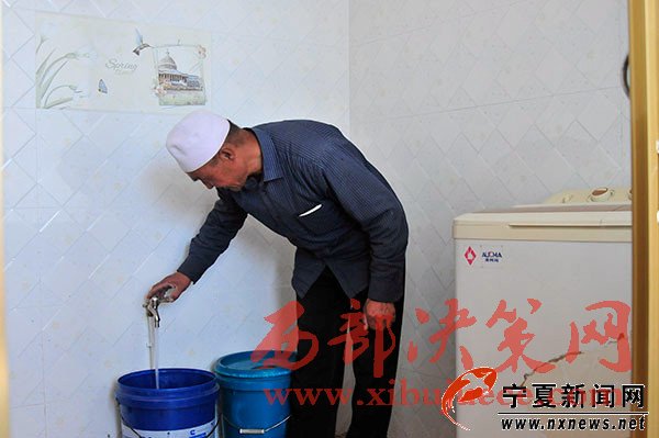 在海原水務局曹洼水利工作站站長牛志遠的帶領(lǐng)下,我們來到了白崖村村民馬正海的家。這是個干凈整潔的院落,兩間并排的磚瓦房,步入屋內(nèi),馬正海正在教老伴如何使用洗衣機。“50多歲了第一次用洗衣機,還不會操作呢” ,馬正海的老伴笑著說,“今年4月家里通上自來水,前陣子就去買了臺洗衣機,這在之前想都不敢想。”