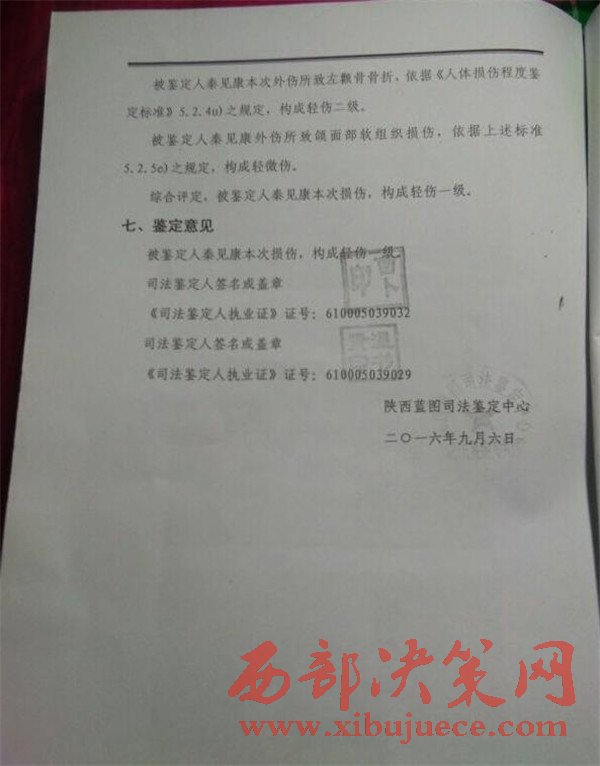 秦見康的出院證明和陜西藍圖司法鑒定中心的鑒定結果。秦見康供圖秦見康向澎湃新聞提供的中國人民解放軍第四軍醫(yī)大學唐都醫(yī)院的出院證明顯示,秦見康7月21日住院,8月9日出院,醫(yī)院診斷結果顯示其右眼眶壁骨折,右眼限制性斜視,右眼鈍挫傷。陜西藍圖司法鑒定中心的鑒定結果顯示,秦見康構成輕傷一級。