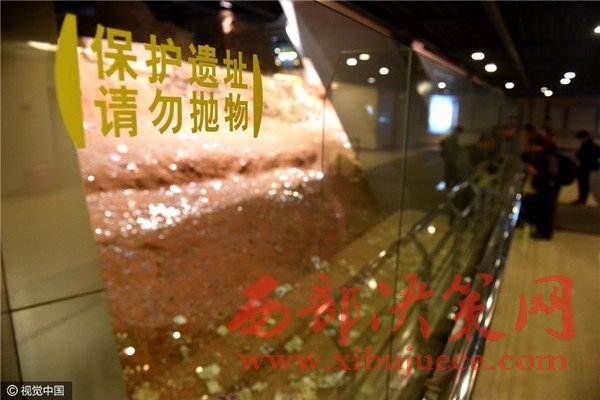 而就在游客身邊的玻璃墻上,赫然寫著“保護(hù)遺址,請勿拋物”8個大字。