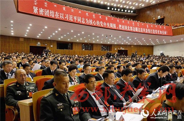 內(nèi)蒙古人民會堂氣氛莊嚴熱烈。來自全區(qū)各條戰(zhàn)線的黨代表,肩負重托、滿懷希望,昂首步入會場。主席臺上方懸掛著用蒙古文、漢文書寫的“中國共產(chǎn)黨內(nèi)蒙古自治區(qū)第十次代表大會”的會標,后幕正中十面鮮艷的紅旗簇擁著金色耀眼的黨徽。二樓的眺臺上懸掛著“緊密團結在以習近平同志為核心的黨中央周圍,把祖國北部邊疆這道風景線打造得更加亮麗”的橫幅。