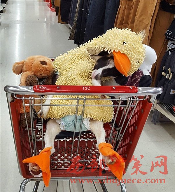 有時(shí)候琳恩出門又不能把Polly一個(gè)羊扔在家里的時(shí)候,就會(huì)給小家伙套上鴨子服,帶它出去。被打扮成鴨子的小羊在陌生的環(huán)境里也不再害怕,還在購(gòu)物車?yán)锎蛄藗€(gè)小盹。