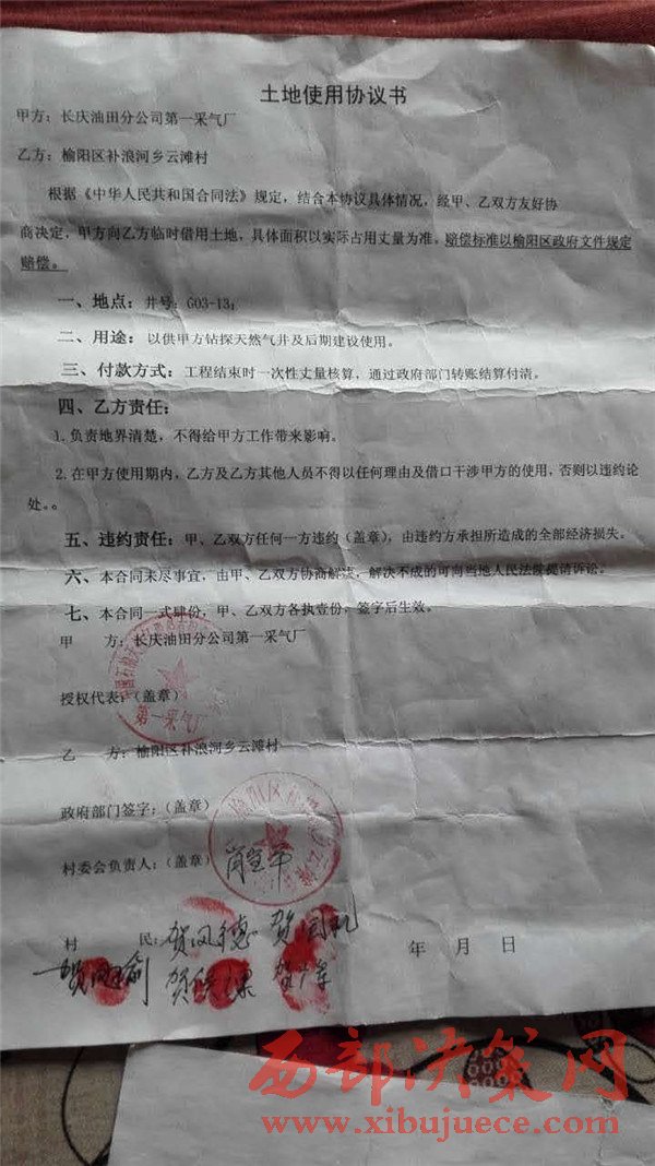 日前,陜西榆林榆陽區(qū)補(bǔ)浪河一村民反映,長(zhǎng)慶油田采氣一廠在他們村征地鉆探天然氣井,村民懷疑長(zhǎng)慶采氣一廠和他們村委會(huì)簽定的《土地使用協(xié)議書》存在著嚴(yán)重的問題。村民向記者看了一份所謂的巜土地使用協(xié)議書》,記者看到這份漏洞百出的協(xié)議書,協(xié)議書的甲方是長(zhǎng)慶油田采氣一廠分公司,而協(xié)議書公章是中國(guó)石油天然氣長(zhǎng)慶股份有限公司(……)分公司,幾個(gè)關(guān)鍵的字根本看不清楚,不知道這個(gè)沒有蓋清楚公章的協(xié)議書到底想掩蓋什么?還是這枚公章就是一枚假公章。協(xié)議書的甲方名稱為什么和公章名稱不符呢?