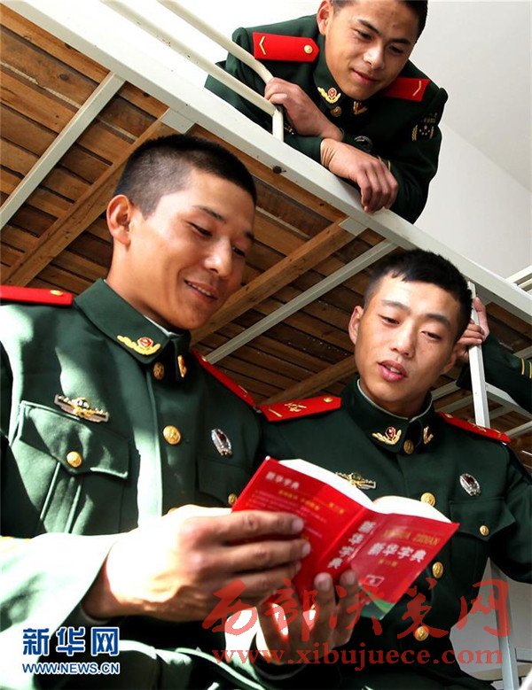 12月5日,艾麥爾·吾斯曼(左一)在連隊(duì)?wèi)?zhàn)友的幫助下學(xué)習(xí)漢語(yǔ)。