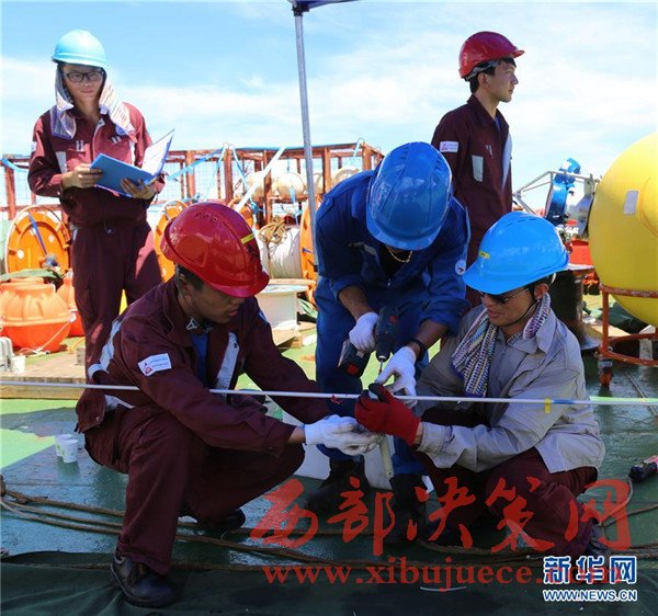 科考隊(duì)員在進(jìn)行深海潛標(biāo)布放和回收作業(yè)培訓(xùn)(11月12日攝)。我國遠(yuǎn)洋綜合考察船“科學(xué)”號(hào)正在西太平洋執(zhí)行潛標(biāo)觀測(cè)網(wǎng)維護(hù)與升級(jí)任務(wù)。截至目前,科考隊(duì)員已獲取了140余件觀測(cè)設(shè)備連續(xù)1年的現(xiàn)場(chǎng)數(shù)據(jù),維護(hù)了8套深海潛標(biāo),并重新布放至西太平洋海域。