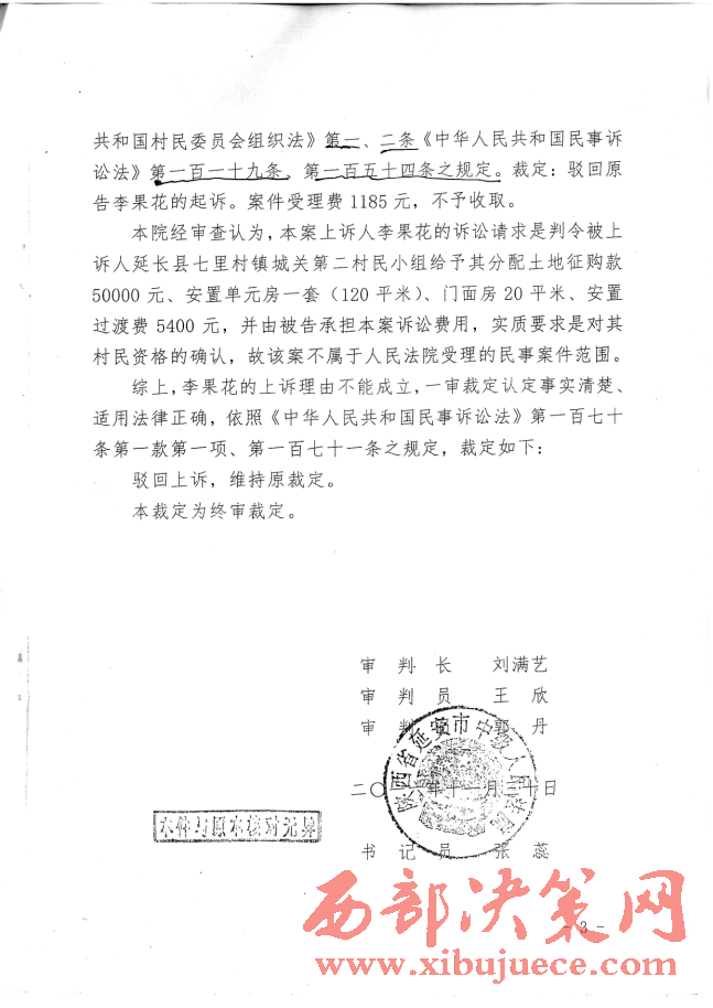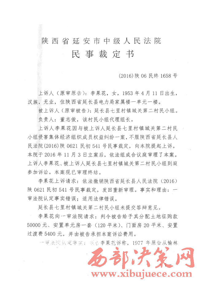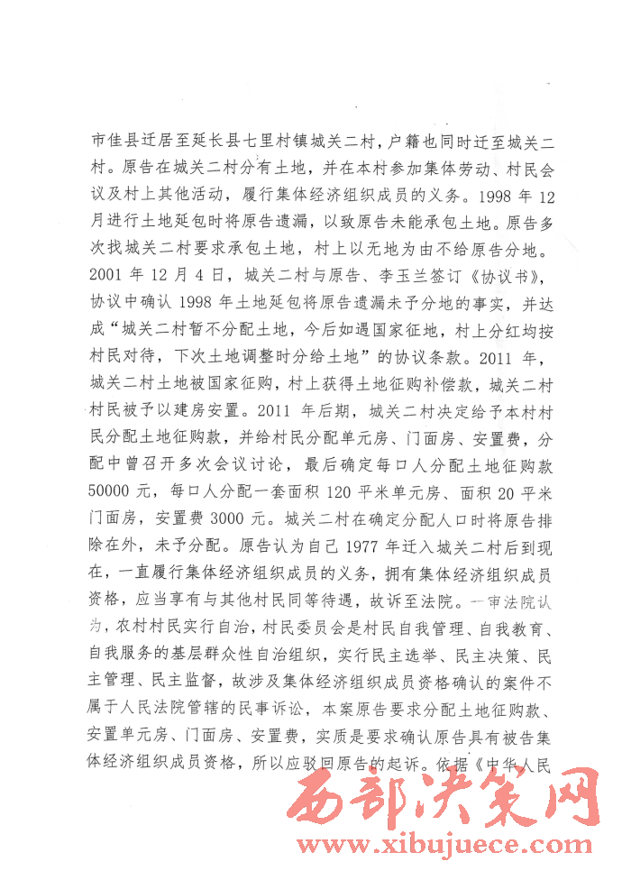 記者又多次翻閱了延長(zhǎng)縣人民法院(2016)陜0621號(hào)民初541號(hào)民事裁定書和延安市中級(jí)法院(2016)陜06民終1658號(hào)民事裁定書,兩級(jí)法院都用同樣的理由是:“李果花的訴訟請(qǐng)求是判令被上訴人延長(zhǎng)縣七里村鎮(zhèn)城關(guān)二村民小組給予其分配土地征購(gòu)款50000元,安置單元房一套(120平米),門面房20平米,安置過(guò)渡費(fèi)5400元,并由被告承擔(dān)案件訴訟費(fèi)用,實(shí)質(zhì)要求是對(duì)其村民資格的確認(rèn),故該案不屬于人民法院受理的民事案件范圍。”一審法院駁回起訴,二審法院是駁回上訴,維持原判。正如反映人李果花稱:“我訴訟的是要回我合法的土地征購(gòu)款、安置房、門面房、安置過(guò)渡費(fèi)。村民的資格確認(rèn),我有的合法的戶口簿、身份證,又有鎮(zhèn)政府領(lǐng)導(dǎo)、村干部、村民代表的協(xié)議書還不夠嗎?”