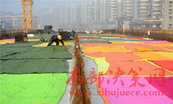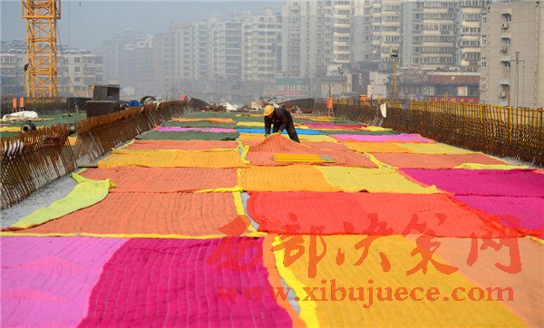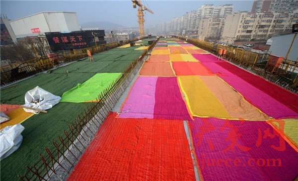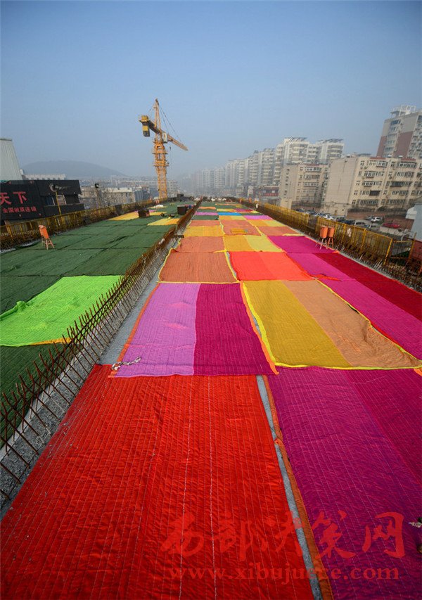 2017年1月2日,濟(jì)南,在七里山路附近的順河高架橋南延施工現(xiàn)場(chǎng),百余米長(zhǎng)的高架橋路面鋪設(shè)了彩色的棉被,總數(shù)達(dá)到100多條,覆蓋面積約2000多平方米 。據(jù)了解,該段高架橋?yàn)樾聺仓南淞?,為確保冬季低溫下混凝土能夠保證強(qiáng)度和防凍,施工采取多種保暖法,為路面蓋棉被取暖。