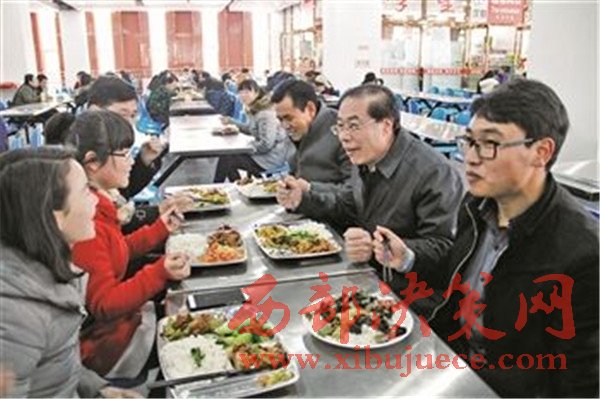 圖為于叢樂(lè)(右二)與學(xué)生一起在學(xué)院食堂共進(jìn)午餐