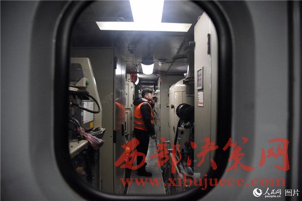 2017年2月3日,司機(jī)趙力強(qiáng)對(duì)火車(chē)頭機(jī)械間進(jìn)行巡檢。