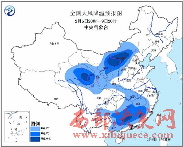 中央氣象臺預計,6日夜間至9日,我國中東部大部地區(qū)都將自北向南將先后出現(xiàn)大范圍大風降溫和雨雪天氣,平均氣溫將普遍下降4℃以上,其中,青海東部、陜西北部、內蒙古中部、山西北部、貴州東南部、湖南中南部、江西中南部、福建西部、廣西北部和廣東北部等地氣溫將下降8℃以上,局地超過10℃!長江以北地區(qū)并伴有4——6級偏北風,東部和南部海區(qū)風力有7——9級。
