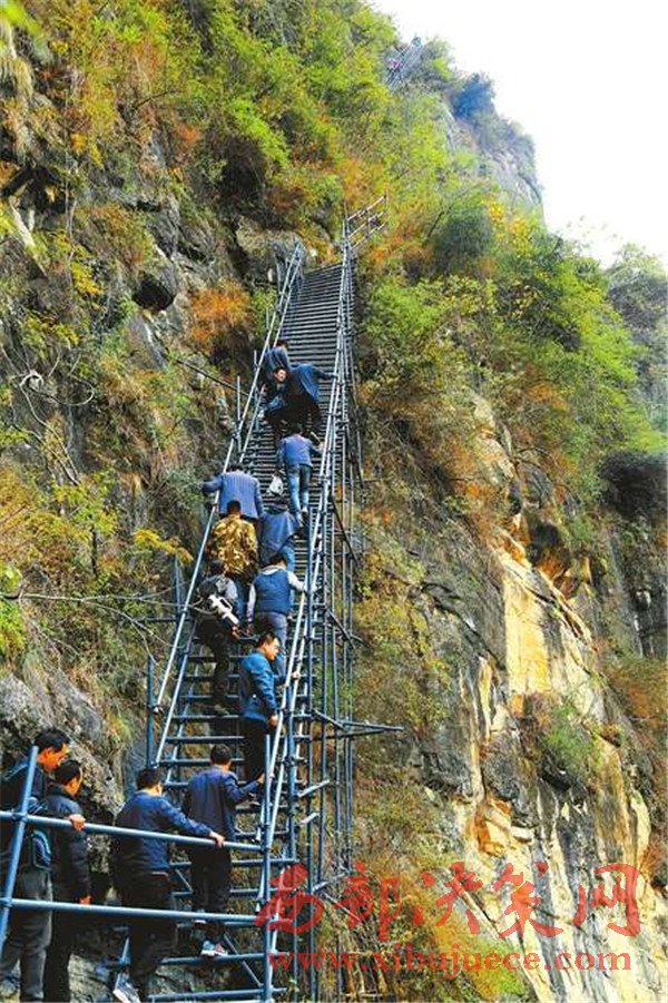 鋼梯,是從去年8月開始啟動(dòng)修建的,州、縣兩級(jí)財(cái)政共投入了100萬(wàn)元。11月,鋼梯完工投入使用。莫色子古說(shuō),這些鋼管牢牢焊入懸崖,一共組成21段、767級(jí)臺(tái)階。整個(gè)鋼梯用了大約1500根、40多噸鋼管,光是固定用的扣件,就用了6000多個(gè)。