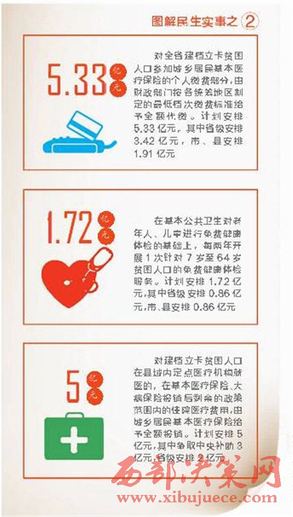 對建檔立卡貧困人口在縣域內(nèi)定點醫(yī)療機構就醫(yī)的,在基本醫(yī)療保險、大病保險報銷后剩余的政策范圍內(nèi)的住院醫(yī)療費用,由城鄉(xiāng)居民基本醫(yī)療保險給予全額報銷。計劃安排5億元,其中爭取中央補助3億元,省級安排2億元