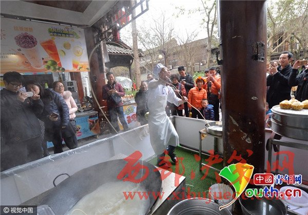 2月22日,田波如往常般工作,面館門口聚集了里外三層的圍觀者。正在拉面的田波,表演的正是網絡上廣為流傳的那個版本。妖嬈的動作,嫵媚的表情,配上黃齡的那首《癢》,整個畫面活色生香。