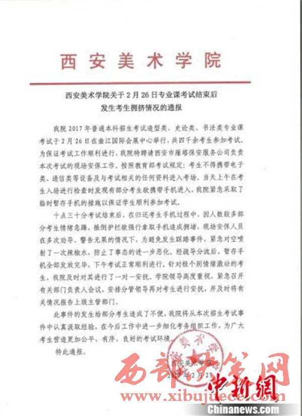 西安美術(shù)學(xué)院發(fā)布的事件通報(bào)稱,考試結(jié)束后,在歸還手機(jī)過程中,因人數(shù)較多部分考生情緒急躁,推倒護(hù)欄欲強(qiáng)行拿取手機(jī)造成擁堵,現(xiàn)場(chǎng)安保人員在多次勸導(dǎo)、警告無(wú)果的情況下,為避免發(fā)生踩踏時(shí)間,緊急對(duì)空噴射了一次辣椒水,防止了事態(tài)的進(jìn)一步惡化。經(jīng)疏導(dǎo)分流后,暫存手機(jī)全部發(fā)放完畢,下午考試順利進(jìn)行。針對(duì)個(gè)別情緒激動(dòng)的考生,該院即使對(duì)其進(jìn)行了一對(duì)一安撫。學(xué)院領(lǐng)導(dǎo)高度重視,緊急召開有關(guān)部門負(fù)責(zé)人會(huì)議,安排分管領(lǐng)導(dǎo)再對(duì)考生進(jìn)行安撫,并及時(shí)將有關(guān)情況報(bào)告上級(jí)主管部門。此事件的發(fā)生給部分考生造成了不便,該院將從本次招生考試事件中認(rèn)真汲取經(jīng)驗(yàn),在今后工作中進(jìn)一步細(xì)化考務(wù)組織工作,為廣大考生營(yíng)造更加公平、有序、良好的考試環(huán)境。