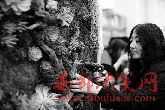 3月13日,西安北二環(huán),經(jīng)過何萌努力創(chuàng)作的這幅多肉風(fēng)景畫已經(jīng)完成。記者看到,整幅畫作高1.9米,寬1米,用60多棵多肉植物及其它綠植組合。何萌說:“我大學(xué)學(xué)的是設(shè)計,畢業(yè)后做過平面設(shè)計,因為喜歡多肉植物便辭掉工作,自己開店賣多肉植物。時間長了總覺得一個一個賣,不但利潤少,也缺乏創(chuàng)意,于是就自己畫畫、寫毛筆字,以設(shè)計稿的方式完成多肉畫作的線稿設(shè)計。”從開始的組裝花盒到現(xiàn)在將多肉做成畫,何萌都全力以赴。