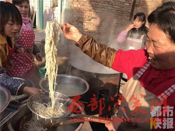 12月4日, 戶縣渭豐鎮(zhèn)元二村,村民們正在興高采烈的烹制著美味大餐,熱鬧非凡,頗有一種過大年的氣氛。熱氣騰騰的臊子面出鍋了,這第一碗面當然要親手端給今天這場特殊宴會的主角——百歲老人段奶奶。