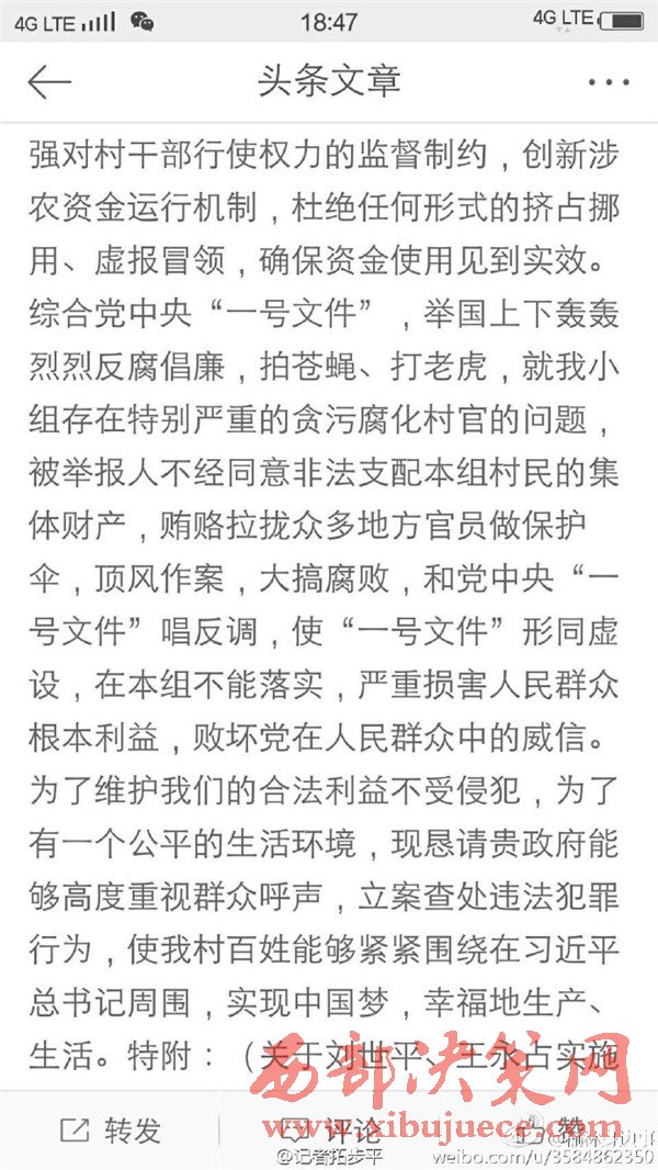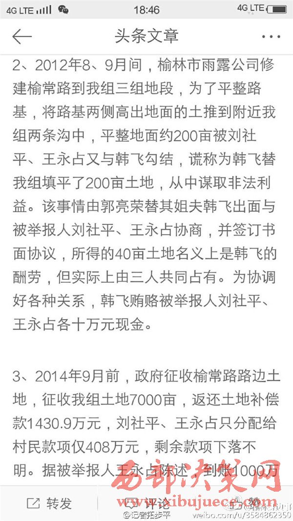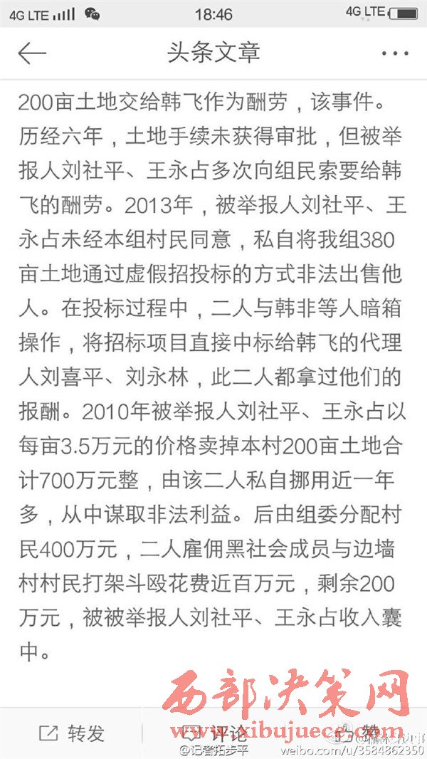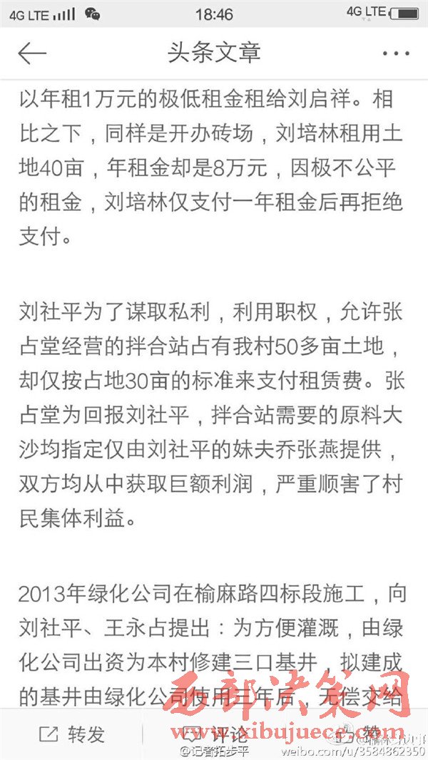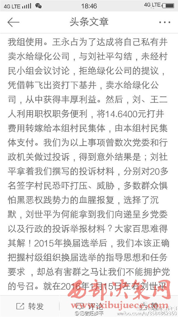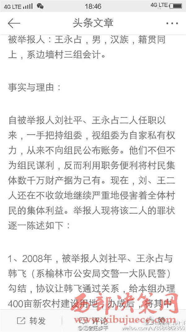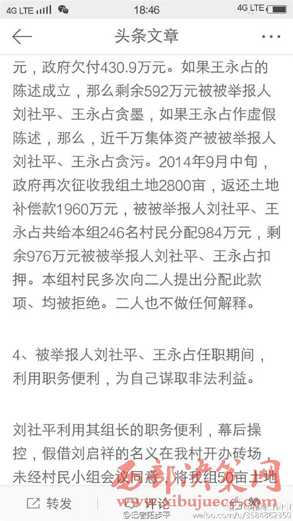近日有微博網(wǎng)友飆新聞微博爆料:自被舉報人劉社平、王永占二人任職以來,一手把持組委,視組委為自家私有權(quán)力,從來不向組民公布賬務(wù)。他們不但不為組民謀利,反而利用職務(wù)便利將村民集體數(shù)千萬財產(chǎn)據(jù)為己有。請相關(guān)部門調(diào)查回復(fù)!
