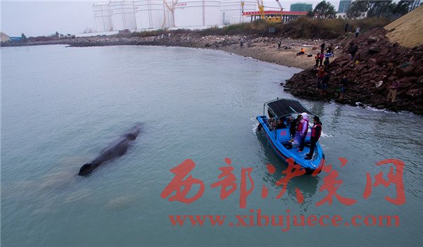 3月14日,在惠州港油庫碼頭附近海域,專家和工作人員查看游向淺灘的抹香鯨。