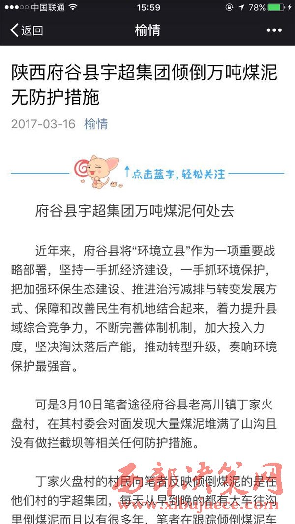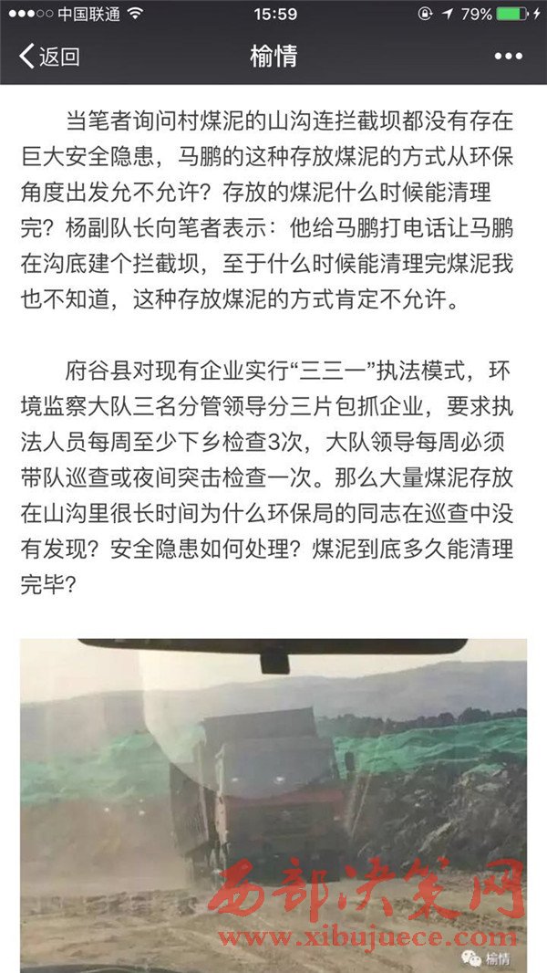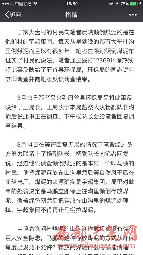 3月13日筆者又來到府谷縣環(huán)保局又將此事反映給了王局長,王局長于本局監(jiān)察大隊楊副隊長溝通后說此事正在調查,下午楊隊長會給筆者回復調查結果。