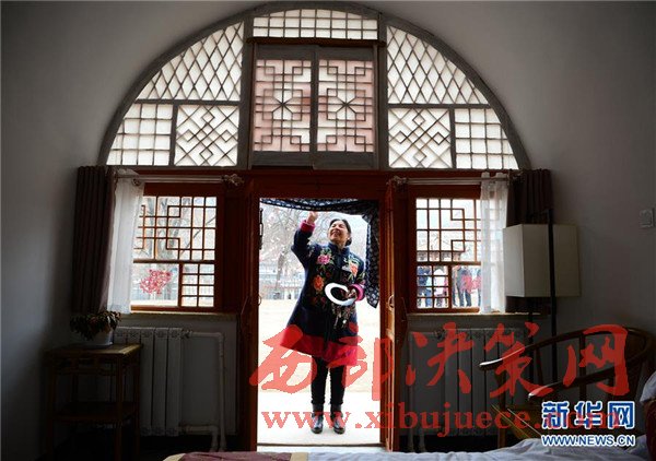 3月15日,佛道坪村村民常鳳蓮在供客人住宿的窯洞門前整理門牌。作為村里旅游項目的服務人員,常鳳蓮每月可領取2000多元工資。