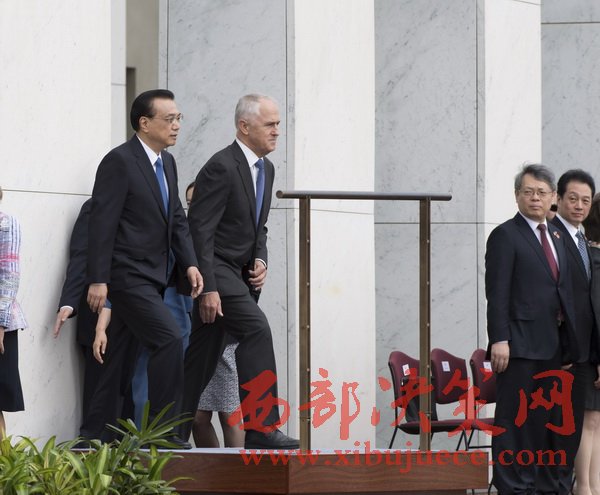 當(dāng)?shù)貢r間23日上午,澳大利亞總理特恩布爾在堪培拉議會大廈廣場舉行隆重儀式,歡迎李克強(qiáng)總理對澳進(jìn)行正式訪問。19響禮炮聲中,特恩布爾夫婦在下車處迎接李克強(qiáng)夫婦。廣場上奏響中國國歌,李克強(qiáng)檢閱了儀仗隊。兩國總理登上檢閱臺后,軍樂團(tuán)再次奏響中澳兩國國歌。