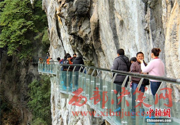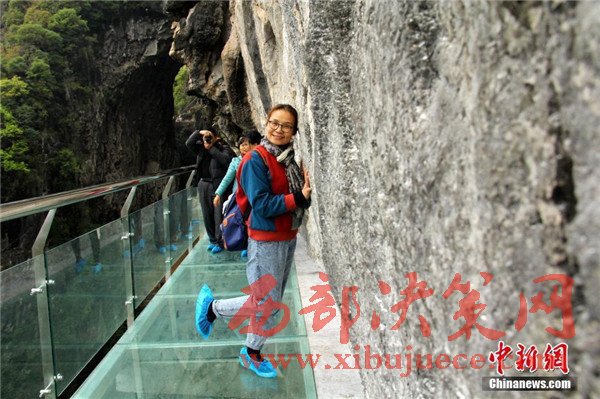 3月24日,地處廣西融安縣石門仙湖景區(qū)的玻璃棧道試運(yùn)行,數(shù)十名游客體驗(yàn)“嘗鮮”。該玻璃棧道建在距離谷底達(dá)60米的懸崖壁上,下方是石門仙湖山石峻峭的中天坑,全長309.4米、寬1.6米,是目前廣西最長的玻璃棧道。