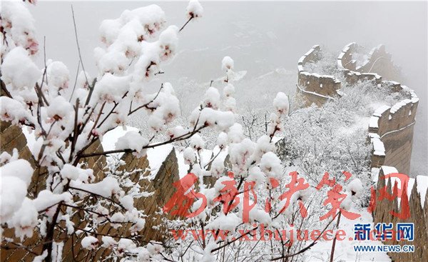 當日,北京市懷柔區(qū)黃花城水長城迎來降雪,杏花、白雪與長城構成了一幅幅美麗畫卷。