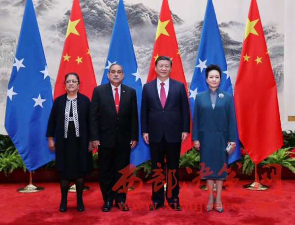 3月27日,國家主席習(xí)近平在北京人民大會(huì)堂同密克羅尼西亞聯(lián)邦總統(tǒng)克里斯琴舉行會(huì)談。會(huì)談前,習(xí)近平在人民大會(huì)堂東門外廣場(chǎng)為克里斯琴舉行歡迎儀式。這是習(xí)近平和夫人彭麗媛同克里斯琴總統(tǒng)夫婦合影。