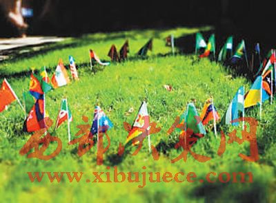 南南學院院內(nèi)的草地上插著20多個國家的小國旗。