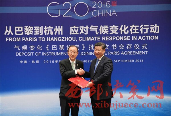 2016年9月3日,國家主席習(xí)近平同美國總統(tǒng)奧巴馬、聯(lián)合國秘書長潘基文在杭州共同出席氣候變化《巴黎協(xié)定》批準(zhǔn)文書交存儀式。這是習(xí)近平向潘基文交存中國氣候變化《巴黎協(xié)定》批準(zhǔn)文書。(記者 蘭紅光 攝)