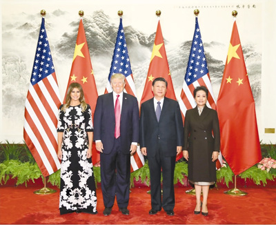 11月9日,國(guó)家主席習(xí)近平在北京人民大會(huì)堂東門外廣場(chǎng)舉行歡迎儀式,歡迎美利堅(jiān)合眾國(guó)總統(tǒng)唐納德·特朗普對(duì)中國(guó)進(jìn)行國(guó)事訪問(wèn)。這是習(xí)近平和夫人彭麗媛在人民大會(huì)堂同特朗普夫婦合影。(記者 蘭紅光 攝)