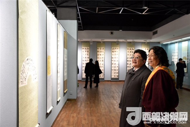 西安工業(yè)大學黨委副書記于孟晨、甘肅省書協(xié)副主席王青彥一同觀看“和天下”書法展。