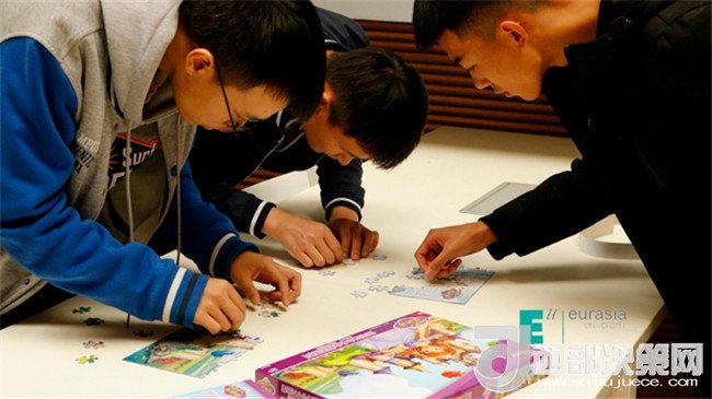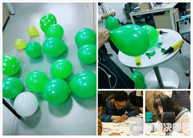 土豆和西紅柿根本就不是一個世界的,但它們走到了一起,變成了薯條和番茄醬它倆就是絕配;學(xué)籍制度和競技運(yùn)動也不是一個世界的,但它們?nèi)诤显诹艘黄?,變成了頭腦風(fēng)暴和趣味運(yùn)動它們也可以很般配,現(xiàn)在就讓我們來看看它們是怎么融合的……聽那陣陣氣球爆炸的聲音,他們開始了!在這些綠油油的氣球中有事先設(shè)置的題目隊員們要先擠爆氣球答完題才能得到下一個地方的線索,“補(bǔ)考成績不合格以及成績低于50分必須怎樣?”“本科選修課學(xué)分不得低于多少學(xué)分?”這些題是不是還要開動腦袋瓜仔仔細(xì)細(xì)的想想才有答案呢?在比賽的現(xiàn)場一秒都會和對手拉開差距,容不得一絲猶豫拿到線索的隊員們又奔向下一個地點熟悉的教室,這里也不是那么容易通過,看著黑板上的題“冰怎么很快的化成水?”“可替代大學(xué)英語四級成績的考試有哪些?”哦,還有計算題,隊員們必須腦洞大開,腦細(xì)胞飛速運(yùn)轉(zhuǎn),做學(xué)霸那也是不容易的。只見黑板上粉筆一起一落,答題完畢,看看線索迅速趕往下一地點——地中海。這里指壓板、跳繩早已準(zhǔn)備好等著隊員們,學(xué)霸不能只管學(xué)習(xí)身體素質(zhì)也很重要,動起來吧!在指壓板上跳繩,誰想出來的?忍受著腳底的疼痛還要揮動跳繩?太受虐,但是我們是一群不屈不撓的新一代,指壓板上跳繩我們也是鏗鏘有力、一絲不茍。終于結(jié)束痛并快樂著的跳繩環(huán)節(jié),卻看到了整整400塊的拼圖,這個環(huán)節(jié)真是讓人又愛又恨,還記得兒時玩拼圖的快樂,但在這激烈的競爭環(huán)境下,卻是讓人有點心慌和畏懼。隊員們最終齊心協(xié)力戰(zhàn)勝了它,細(xì)心、耐心的逐一完好的拼完了每一副圖。