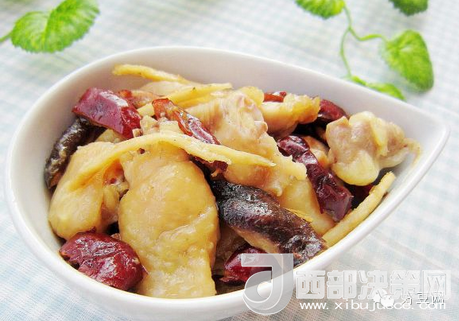 1.把雞斬塊,姜切絲加入雞塊內(nèi)。