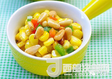 甜玉米粒300g、松子30g、黃油15g、砂糖、鹽、綠色彩椒、紅色彩椒。