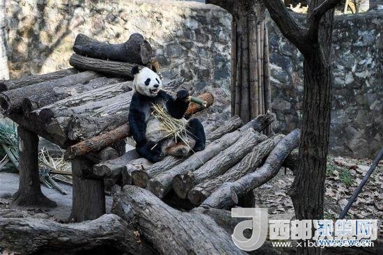 大熊貓盡享冬日暖陽品嘗新鮮的竹子