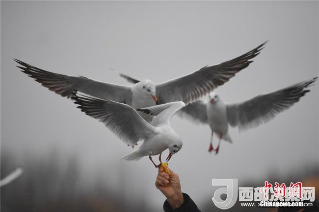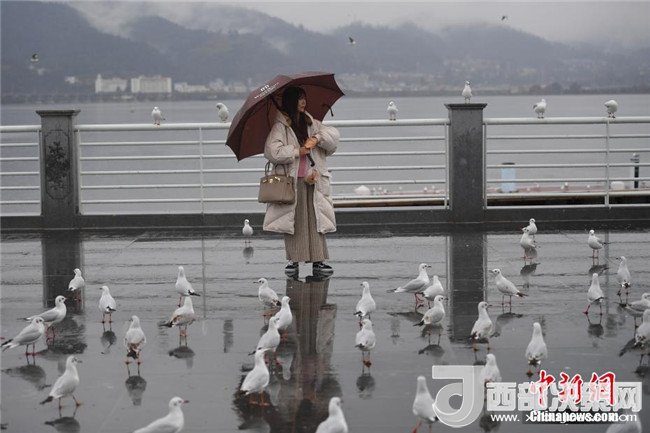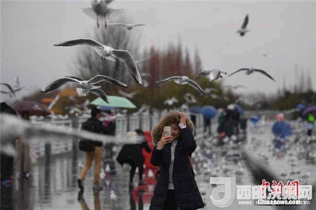1月3日,紅嘴鷗在滇池邊與游客親密接觸。當日,“春城”昆明淅淅瀝瀝的小雨下個不停,仍有眾多游客和市民來到滇池邊,與西伯利亞的“白色精靈”——紅嘴鷗相會,領(lǐng)略昆明別樣美景。(記者 劉冉陽 攝)