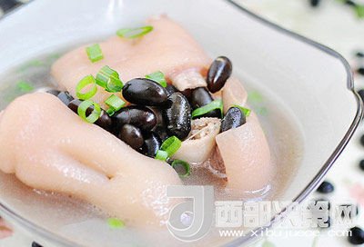 2、再將洗好的黑豆、姜片與豬蹄一塊放入鍋中,用文火煲3小時,然后加入適量鹽即可。