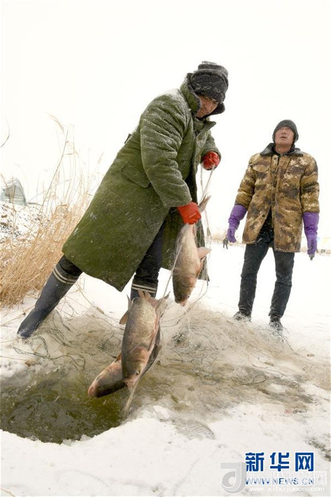 1月6日,在內(nèi)蒙古杭錦后旗鴻雁湖,捕魚人展示捕撈上來的魚。(支茂盛 攝)
