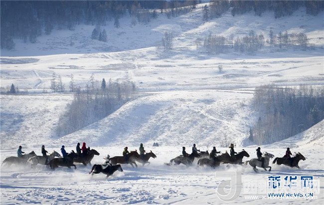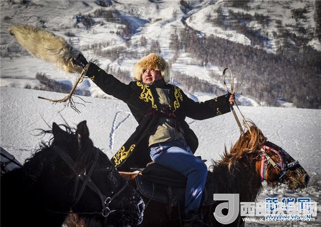 在新疆喀納斯禾木村舉辦的潑雪節(jié)上,當(dāng)?shù)鼐用裨跒橛慰捅硌萏?月1日攝)。記者 趙戈 攝