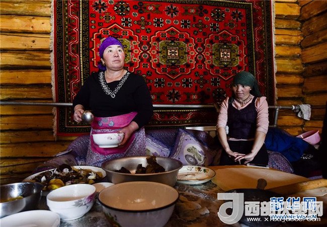 在喀納斯禾木村美麗峰腳下的“迪娜小屋”里,男主人奇肯讓游客品嘗哈薩克族美食——馬肉納仁(1月2日攝)。記者 趙戈 攝