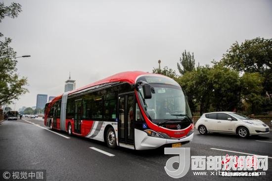 2017年10月22日,北京,首批以“中國紅”為外觀主題的18米純電動公交車投入運(yùn)營。圖片來源:視覺中國