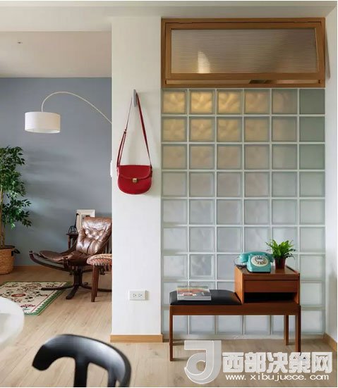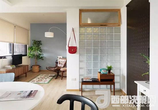 客廳的前方是隔開的陽(yáng)臺(tái),背面則是衛(wèi)浴室,一處墻面用玻璃磚代替,增加了衛(wèi)浴室的采光,和白色墻面比起來(lái)更顯通透。