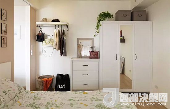 藤筐、收納箱、掛衣桿、衣柜,各種收納工具一應(yīng)俱全,搭配得十分得宜。衣柜中間柜門上安裝了全身鏡。對(duì)于不愿把鏡子放進(jìn)臥室的房友們來(lái)說(shuō),不知道這樣子布置會(huì)不會(huì)稍好一些。