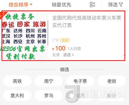 1月30日下午,人民網(wǎng)IT頻道在某著名電商平臺(tái)搜索“火車(chē)票代購(gòu)”,在首屏也能搜到疑似黃牛的賣(mài)家,其廣告圖片里就有“春節(jié)回家、12306官網(wǎng)出票”等字樣,標(biāo)價(jià)為100元,與這篇報(bào)道的黃牛加價(jià)情況基本一致。